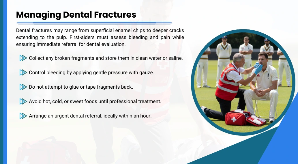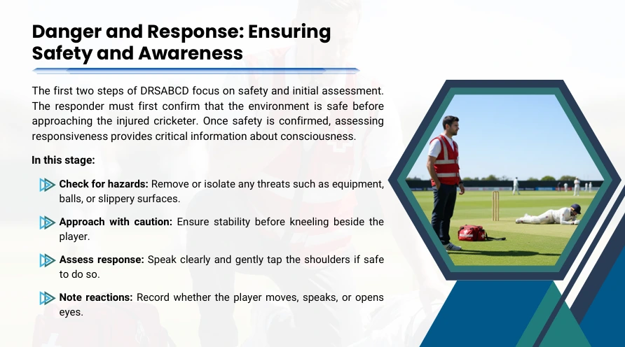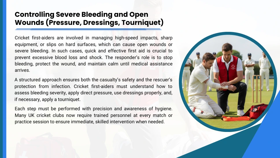 The course covers emergency scene management, CPR and AED use, and life-threatening conditions seen in cricket. It also focuses on concussion awareness, head and spinal injuries, fractures, soft-tissue injuries, and environmental risks such as heat stress. This Basic cricket first aid training reflects UK guidance, using clear explanations and examples to support understanding and safe decision-making during play.