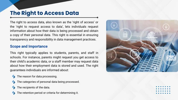 This course begins with an introduction to data protection law in education, ensuring staff understand the legal framework and its impact on everyday school operations. It then explores the roles and responsibilities of data controllers, processors, and school staff, highlighting accountability and compliance. Moreover, our data protection training for schools course will cover the lawful basis for processing pupil data, consent management, and how these apply to real-world school scenarios.
