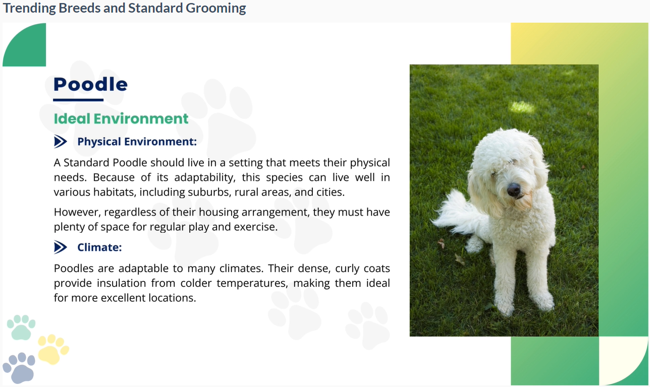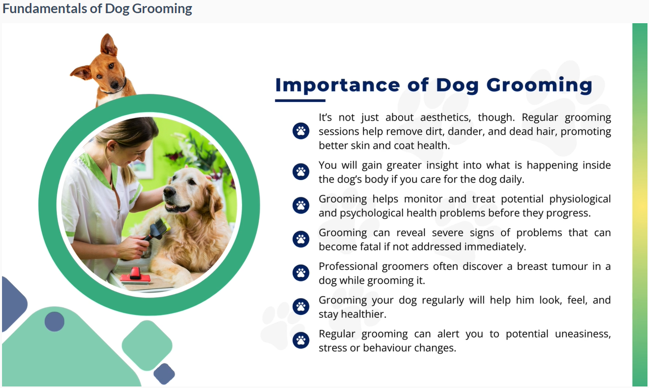 Grooming isn’t just about looks—it’s also about keeping dogs healthy. That’s why this dog grooming diploma course covers canine first aid, dealing with skin disorders, and managing emergencies like heat stroke or circulatory arrest. You’ll also get hands-on knowledge of bathing techniques, handling different coat types, and using professional grooming tools correctly.