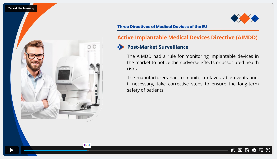 Through the accredited online course, you’ll learn how to manage technical files, implement quality management systems (QMS), ensure device traceability, and follow the correct procedures for incident reporting and adverse event management. Additionally, you will understand the essential MDR concepts, such as classification rules, identification procedures, and the importance of post-market surveillance. This training provides you with clear explanations, ensuring that even the most technical aspects are easily understood and implemented.