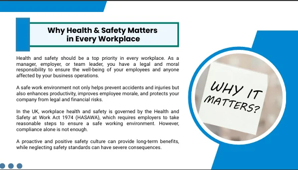 Whether you’re a team leader, manager, safety officer, or supervisor, this training covers everything from understanding health and safety responsibilities to embedding safety culture and applying practical management techniques. The course begins with the fundamentals, including why health and safety matters, legal duties of employers and employees, and key workplace regulations compliant with UK legislation.